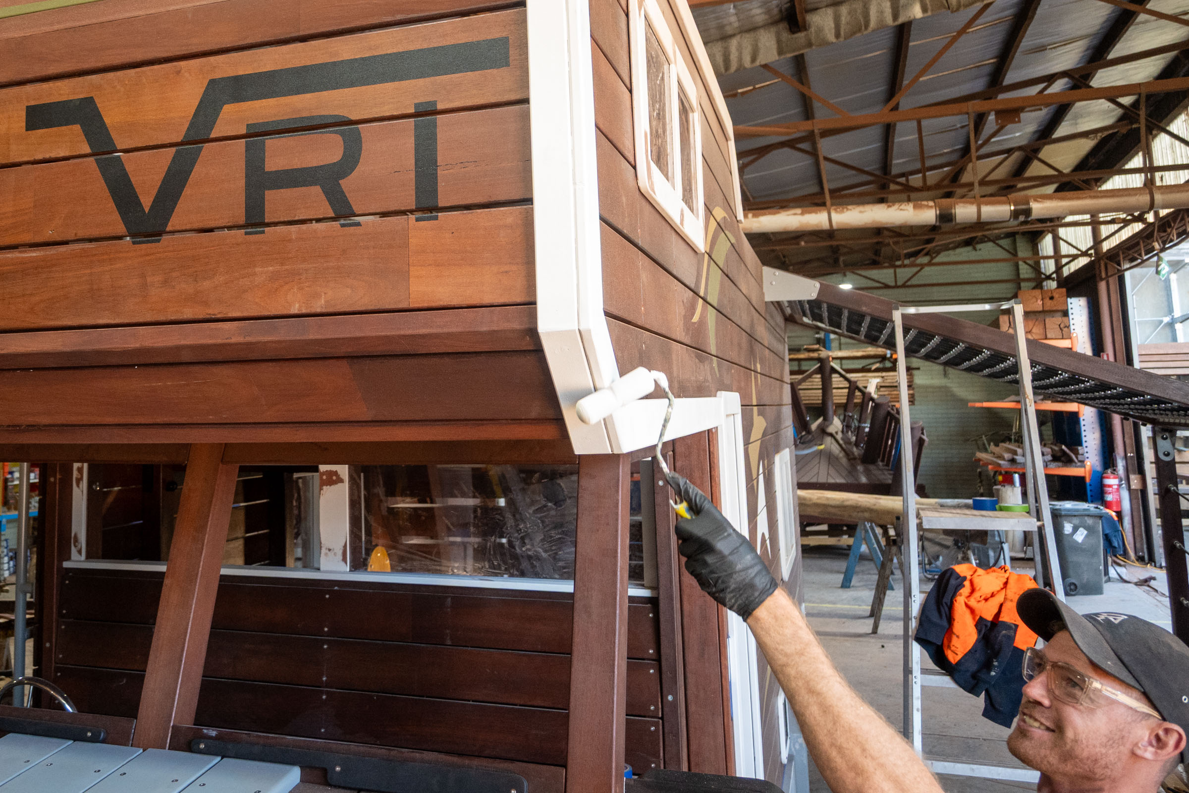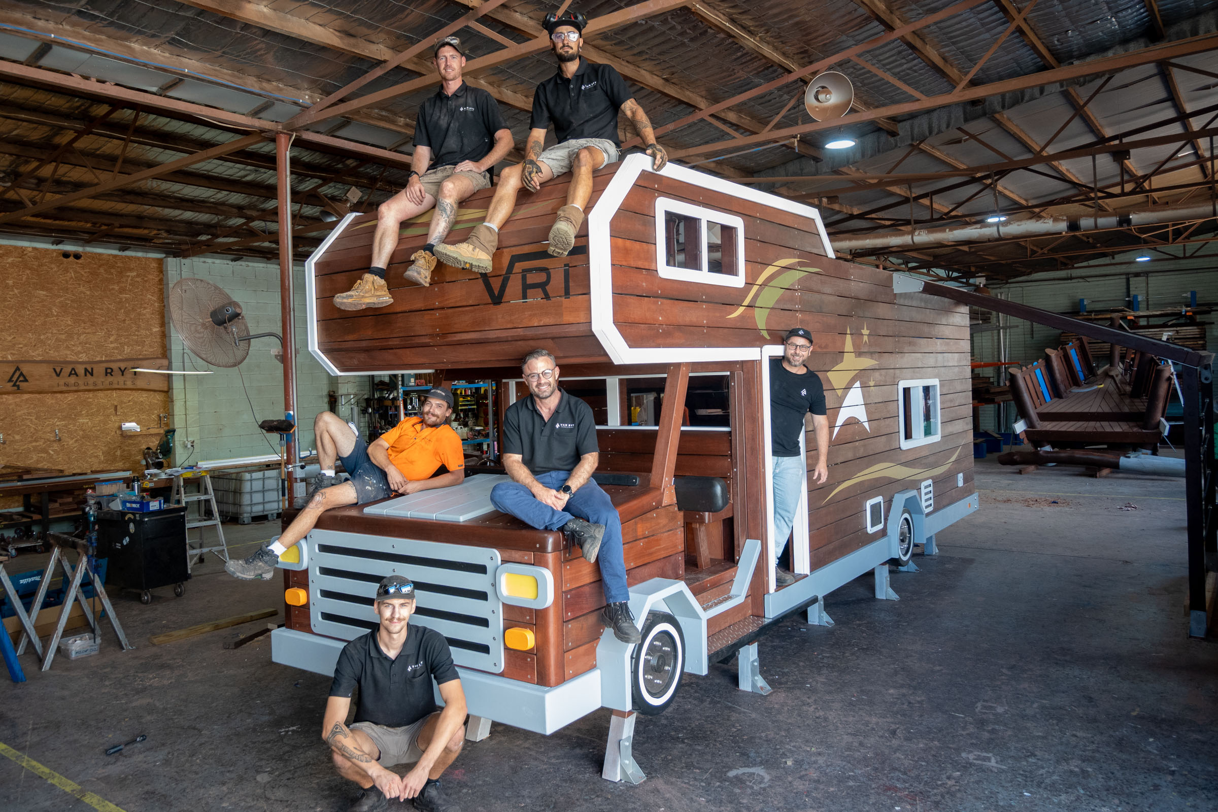 The Motorhome took 450 to 500 man hours to build in VRI's O'Connor WA workshop. It is life-size — approximately 4 tonnes of West Australian Jarrah hardwood and steel — and loaded with play from bonnet to back bumper.
