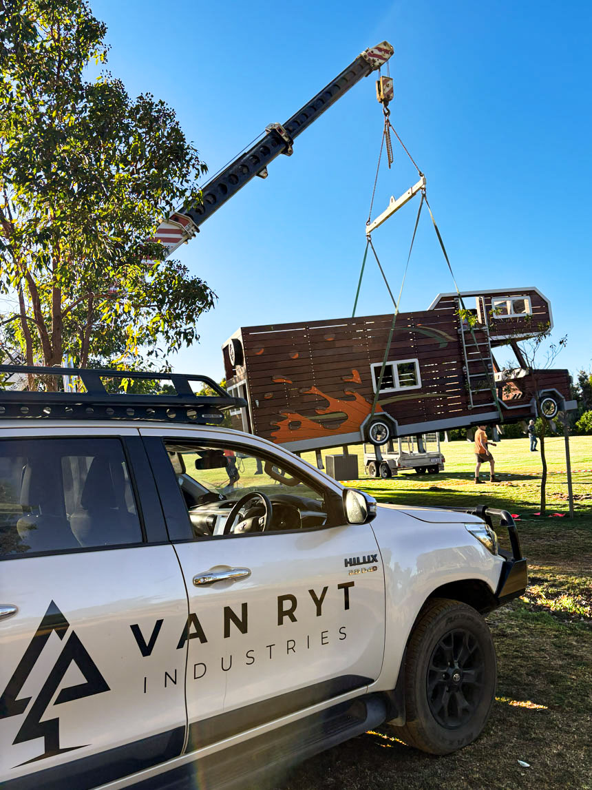 This is what holiday park playground equipment looks like when it starts with a relationship, grows through a design process, and arrives as something a venue can genuinely call its own. Van Ryt Industries designed three products for this installation: the 524-MTH Motorhome — a life-size West Australian Jarrah timber motorhome playground — the 432-CLC Clothesline Climber, and a 205-DAS Double A-Frame with Basket and Double Swings. The Motorhome and Clothesline Climber are both now part of the VRI range — because that is how VRI products come to life. Bespoke to a client, then available to the world.