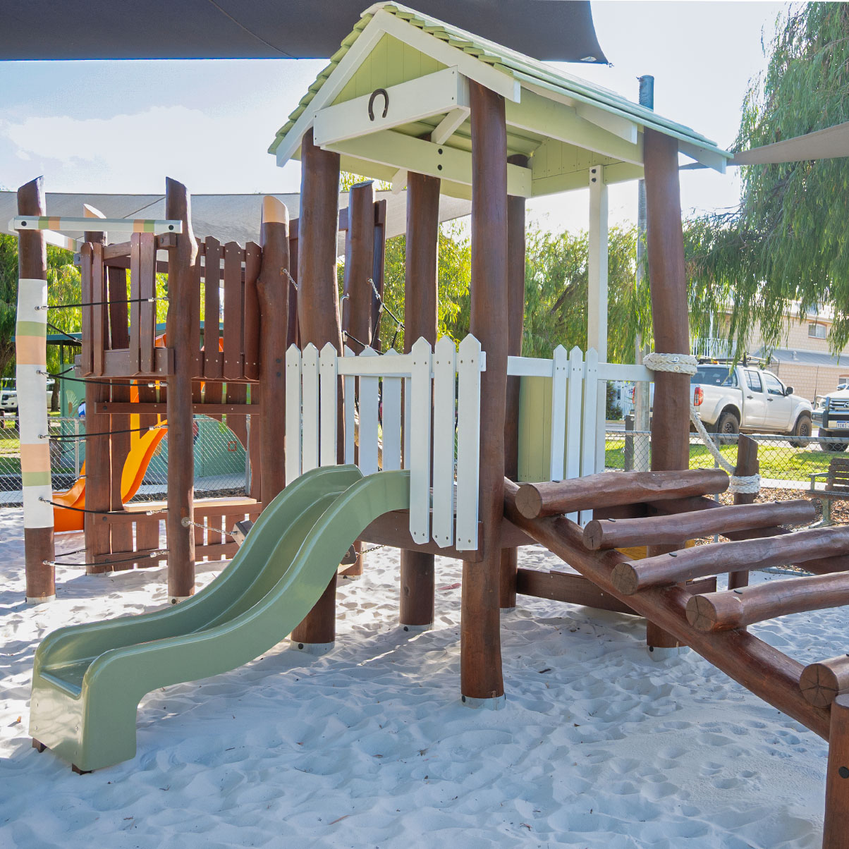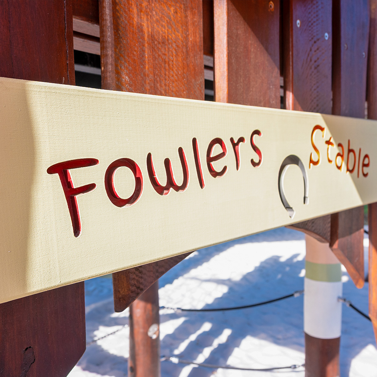 VRI's response to that brief was the 172-GFO Giddy-Up Forts — a dual-level West Australian Jarrah timber stable fort that draws directly from the history of the place. The custom stable shopfront beneath the elevated adventure deck bears the name Fowlers Stable, honouring Mr. Fowler's role in bringing this land to the community. Horseshoe details on the gable, white painted picket balustrading, and colour-banded dressage poles complete the theme.