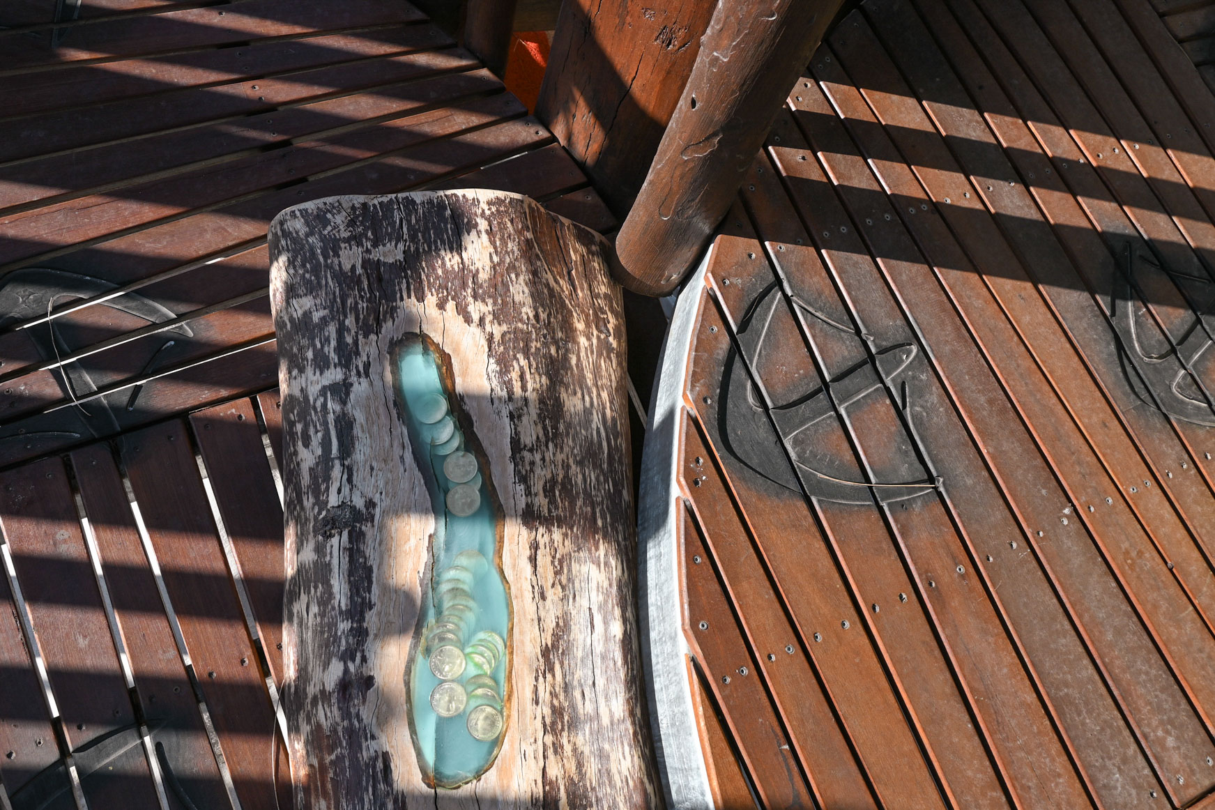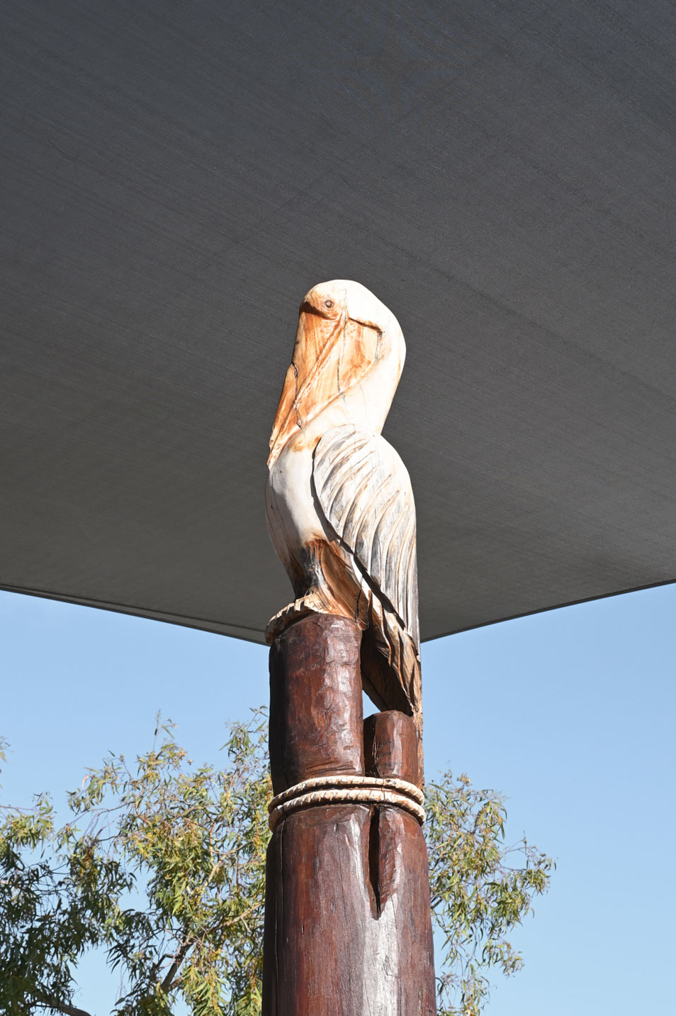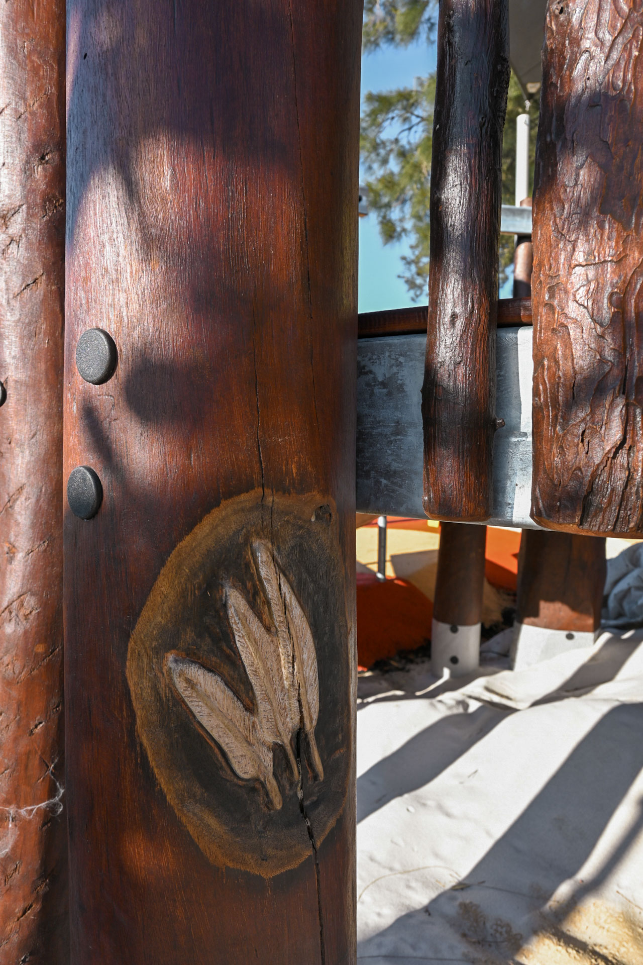 The play structure "VRI Pelican Nest Fort" is a unique, custom-built multi-level platform that echoes the appearance of a pelican's nest, integrating elements that encourage exploration and discovery. Key to this design were intricate details embedded within the play structure, such as resin-cast features like coins, a message in a bottle, shells, and other nature-inspired items. These elements were strategically placed in the structural bush poles, adding an element of surprise and delight for the children, enhancing both their play experience and imagination.