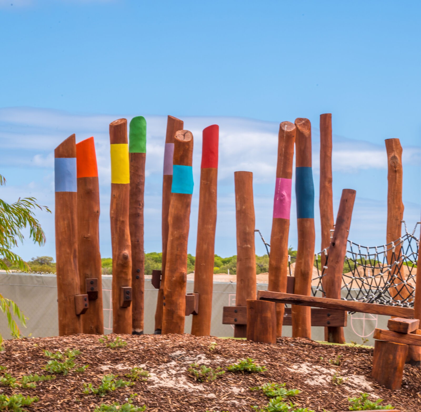Crafted in our O’Connor WA workshop using West Australian Jarrah hardwood, this climbing structure features milled timber foot holds with secure connections, are mounted at varying heights to the Jarrah bush poles. Customise the colours of the poles to suit your playground colour palette. The weather-resistant timber finish provides excellent grip while maintaining the natural characteristics of the timber poles.