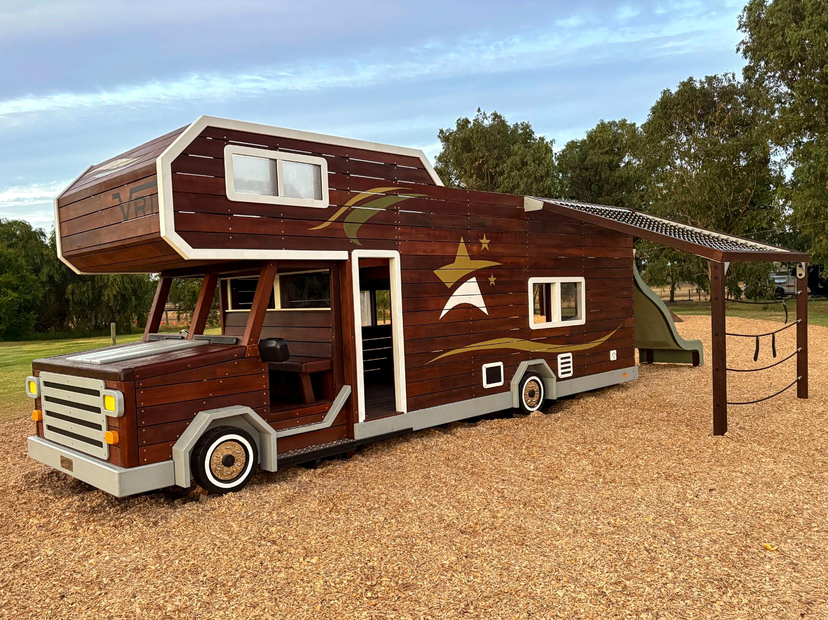 Product Features: • Life-size Jarrah Motorhome – standout venue centrepiece • 1.8m double slide for double the fun • Multi-level play decks at 1.8m and 2.1m • Mud-look spray climbing wall with carved handholds • Stainless steel steering wheel, hub caps & mirrors • Rope net awning, swinging hammock & novelty washing line