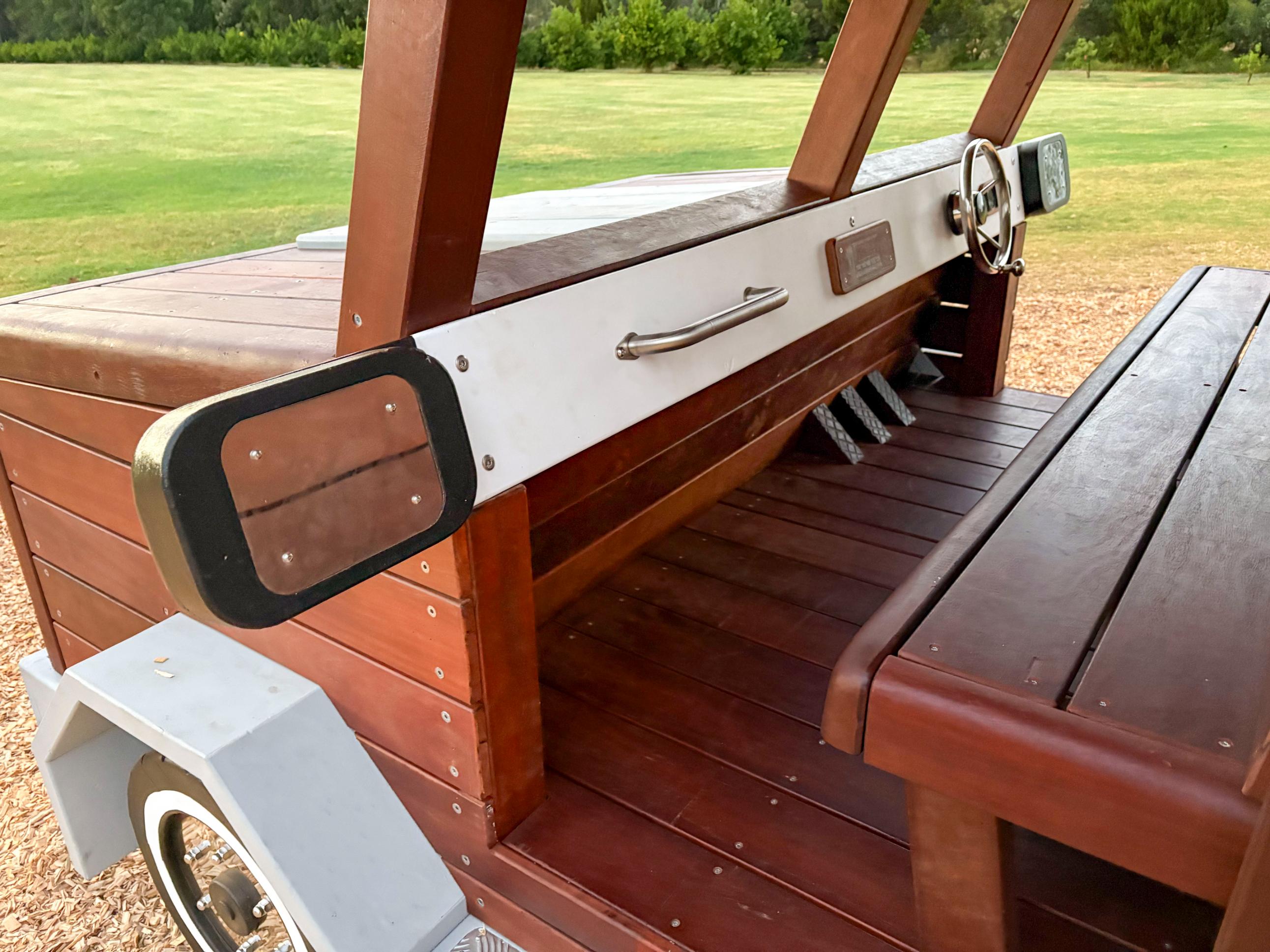 Handcrafted in our O’Connor WA workshop using locally sourced West Australian Jarrah hardwood (subject to availability), the Motorhome features detailed Jarrah and crafted lights, grilles and creative features. UV-stabilised clear windows and hand-carved painted Jarrah wheels with polished stainless steel hub caps. All exposed structural timber is Jarrah throughout, delivering a commercial-grade structure built for intensive daily use.