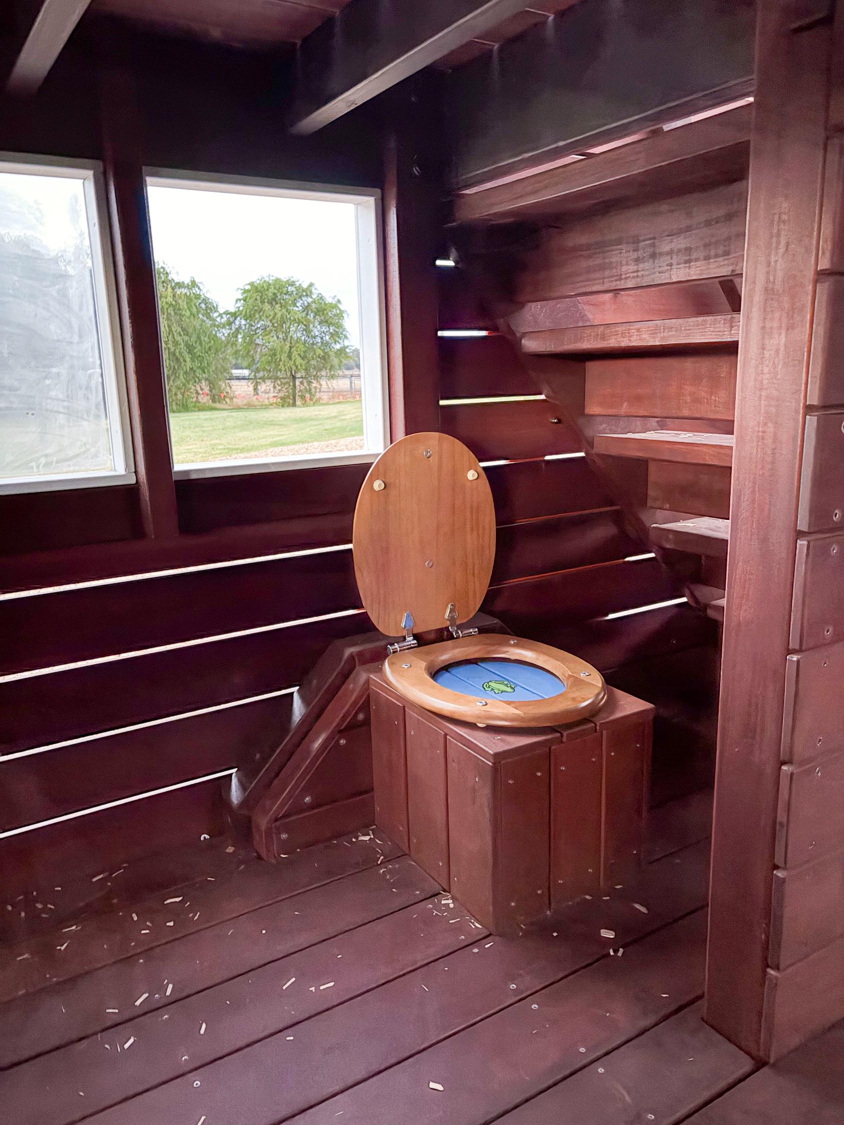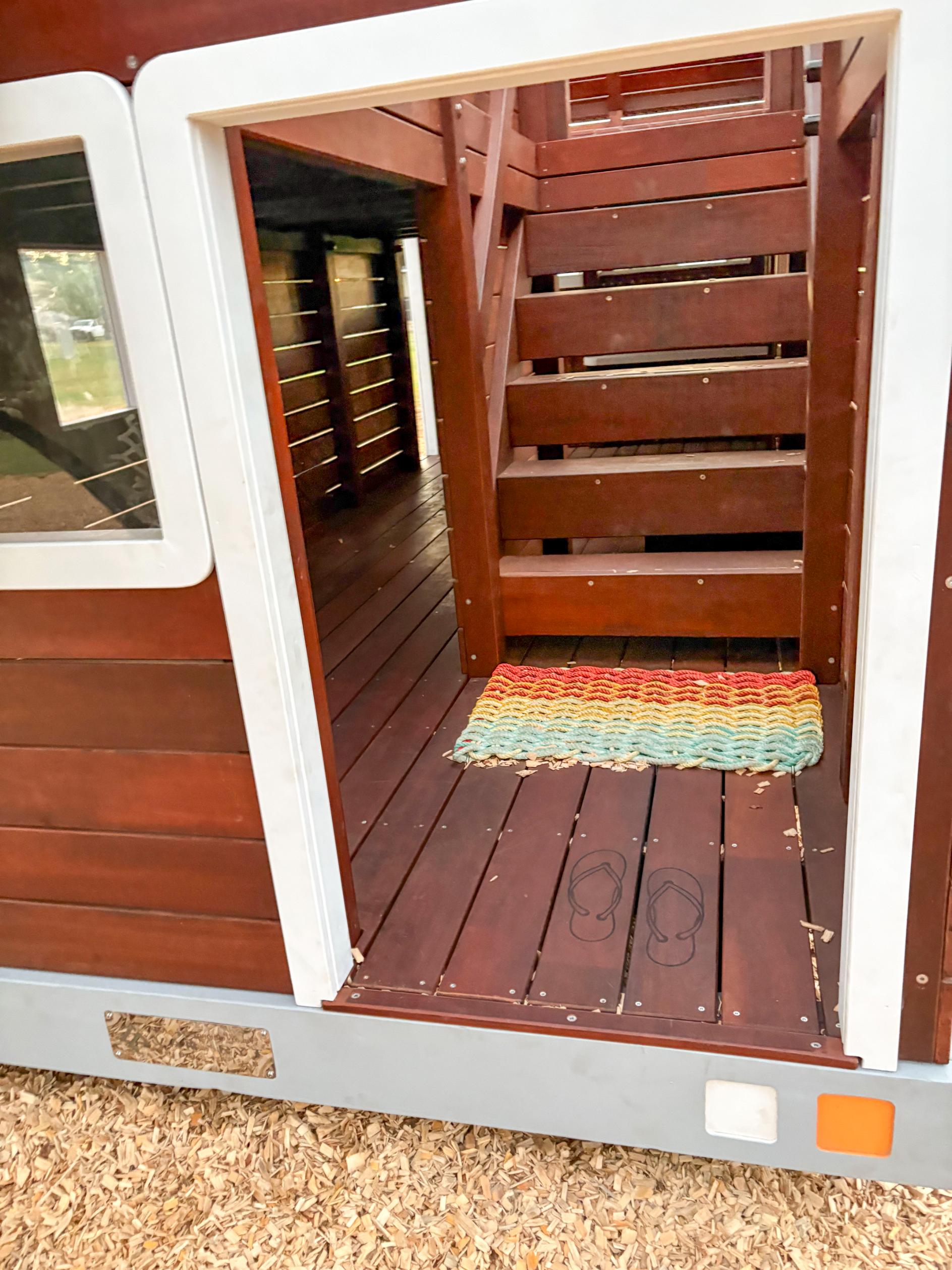 The density of play opportunities is extraordinary — stainless steel steering wheel, dashboard controls and side mirrors in the driver’s cabin; a mud-look spray climbing wall with carved handholds; a swinging hammock tucked into the back corner behind the climbing wall; a novelty washing line hung with rubber socks and undies; and even a toilet complete with a resident frog. The Internal spaces, multi-level decks at 1.8m and 2.1m create natural grouping zones for younger explorers finding their feet and older children tackling the rope net challenges above.