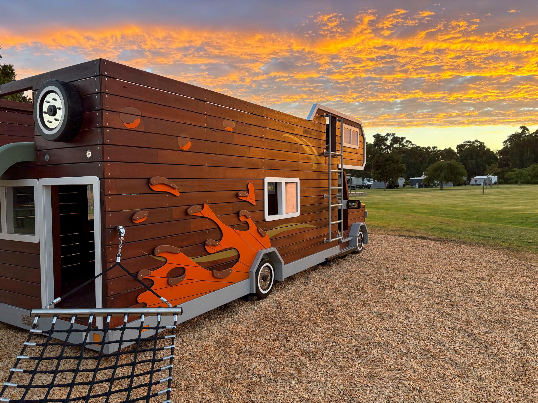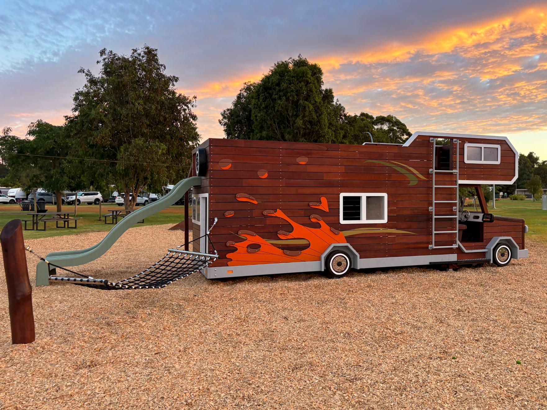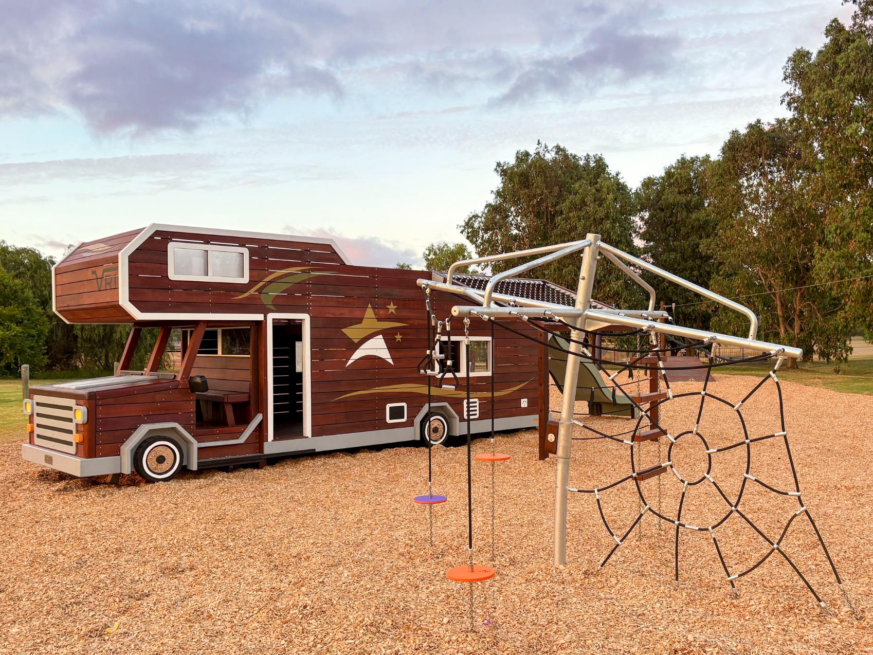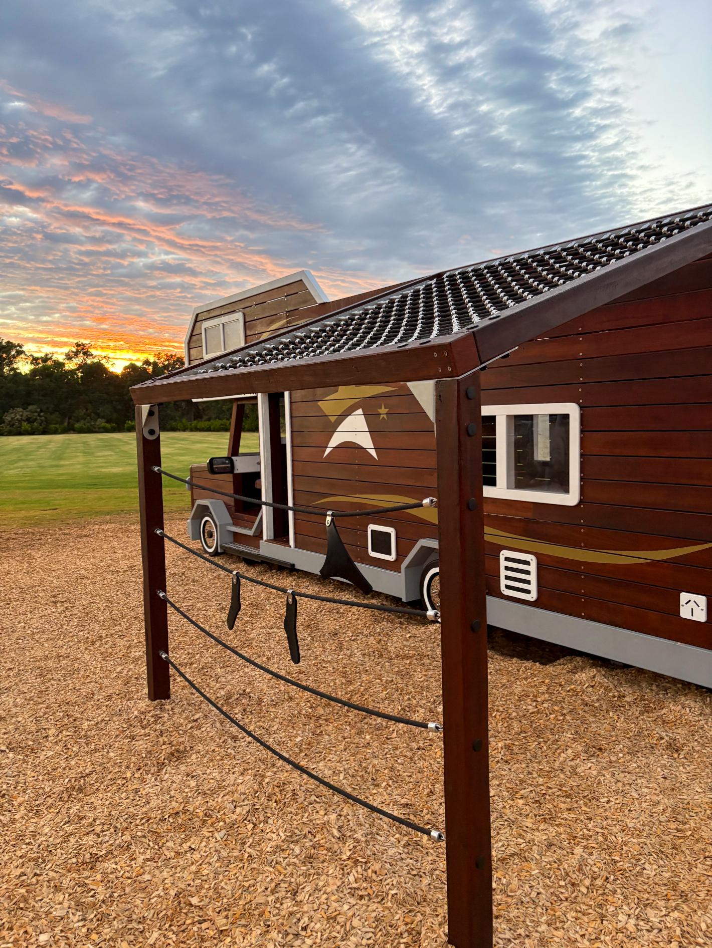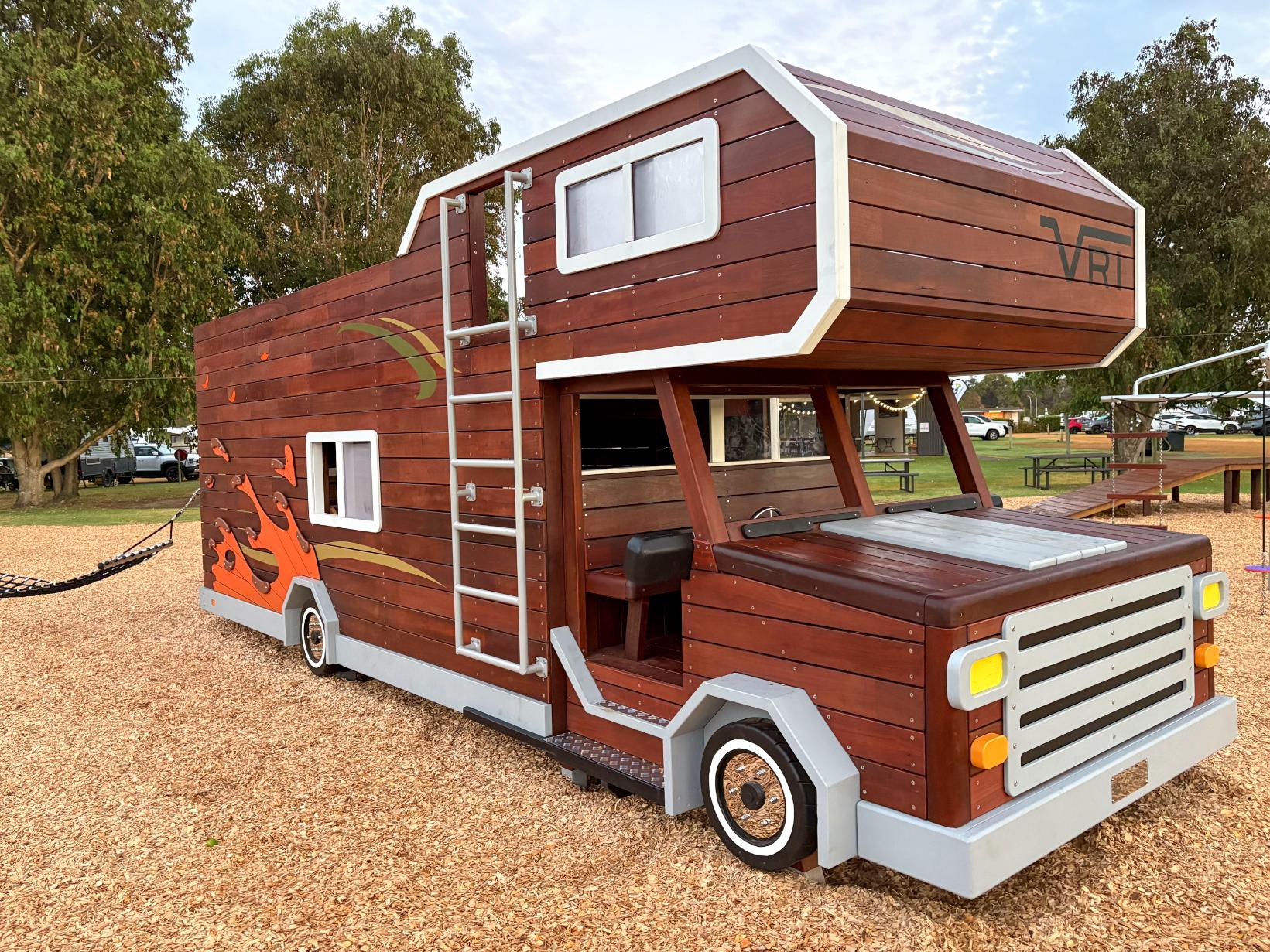Give the young guests at your venue a road trip they’ll never forget — the timber motorhome playground Australia’s holiday parks and hospitality venues choose is a life-size Jarrah Motorhome loaded with imagination play from bonnet to back bumper. Kids can take the wheel in the fully detailed driver’s cabin, explore two deck levels, race down the 1.8m double slide, and tackle the traverse climbing wall and rope net awning.